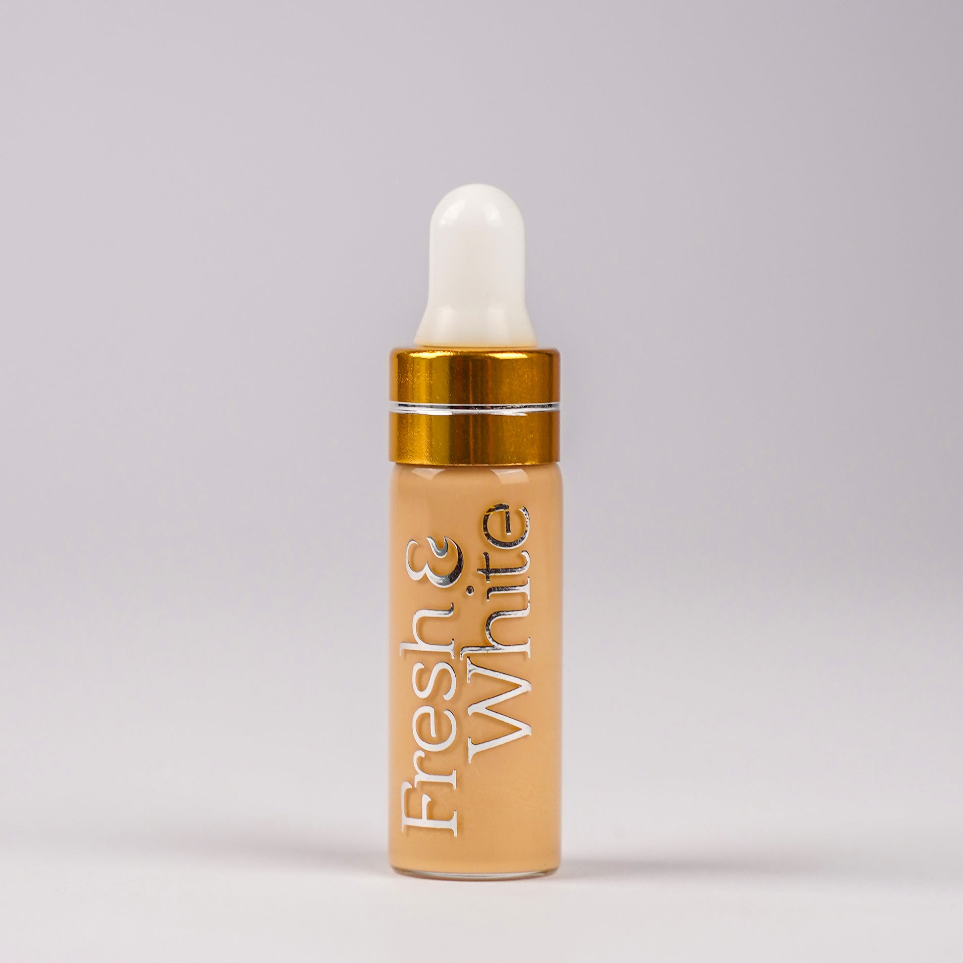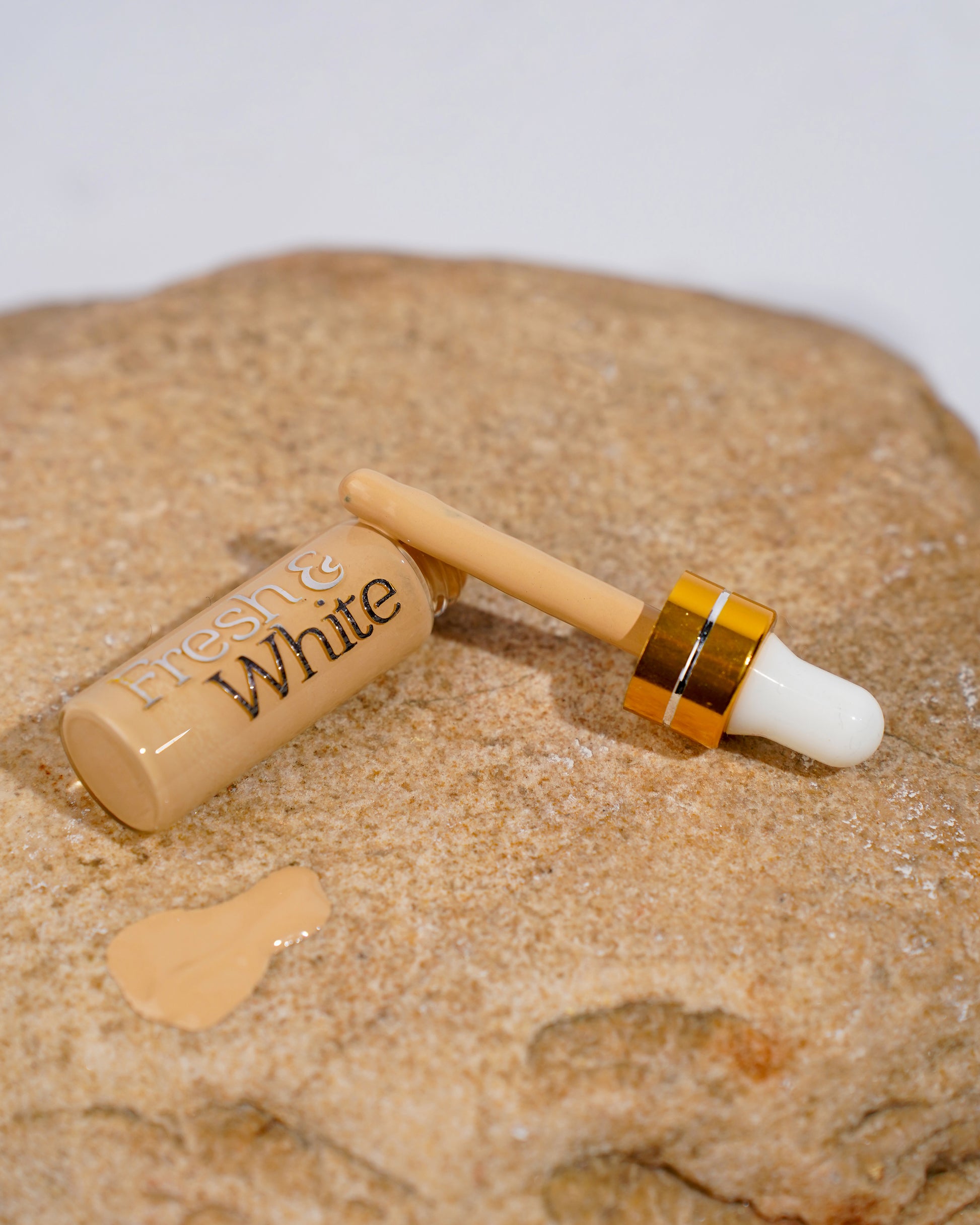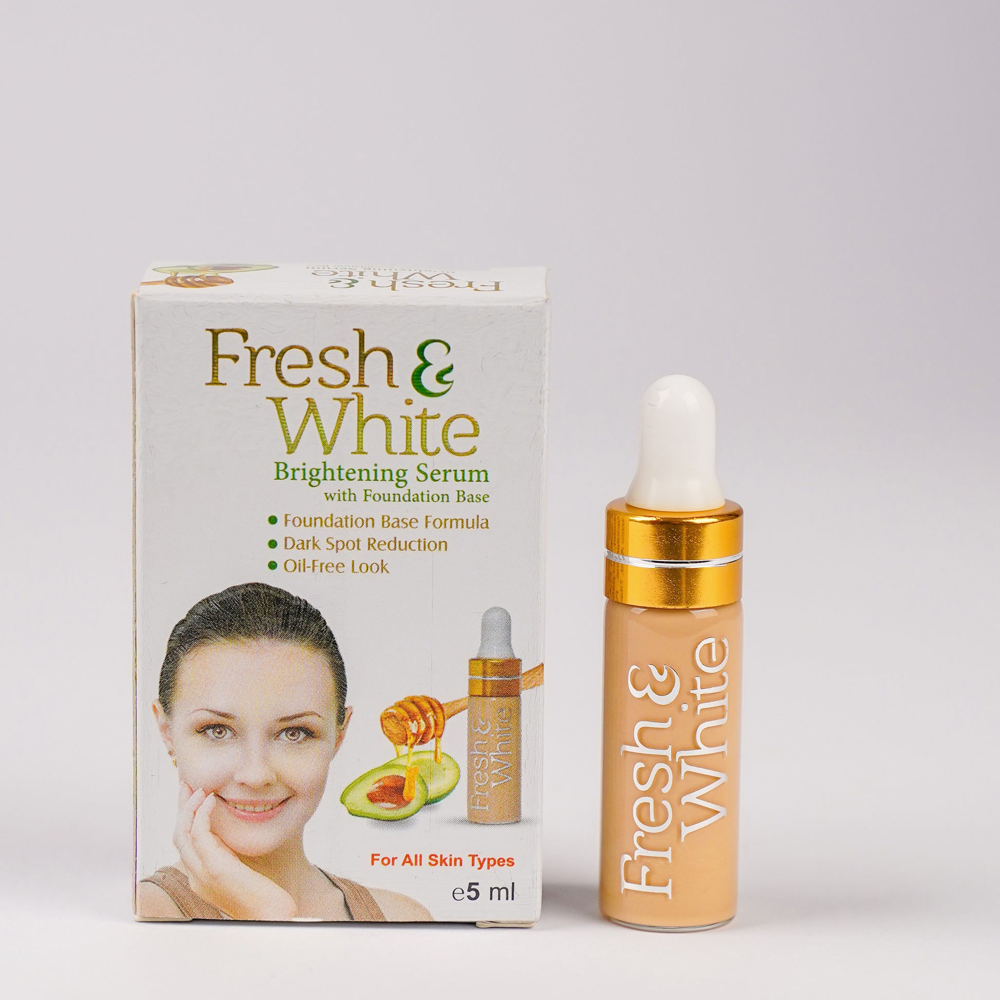 Experience dual action with the Fresh & White Brightening Serum, a unique lightweight foundation base enriched with Vitamin C, Hyaluronic Acid, Niacinamide, and Peptides. Designed for all skin types, this multitasking serum not only evens skin tone but also helps minimize pores, reduce redness, and diminish dark spots.